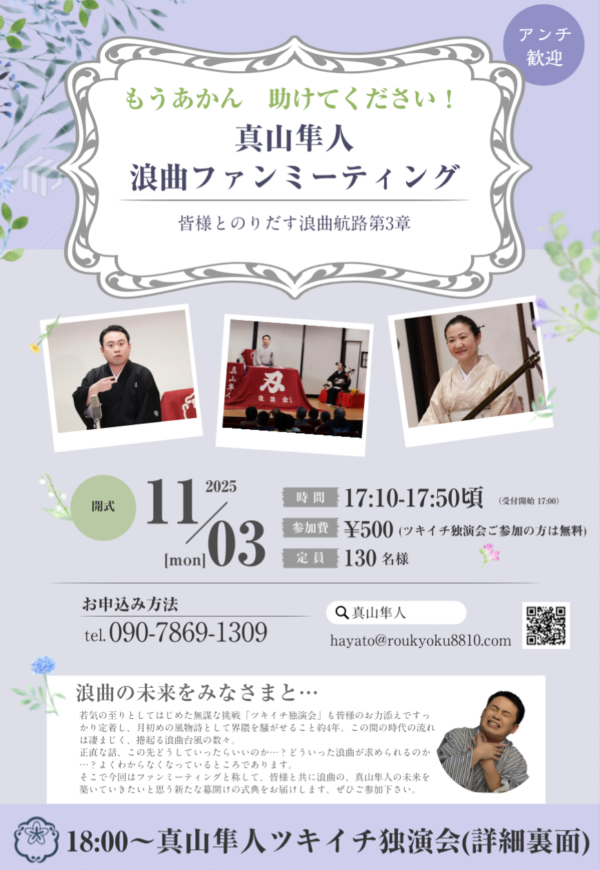 そこで今回はファンミーティングと称して、皆様と共に浪曲の、真山隼人の未来を築いていきたいと思う新たな幕開けの式典をお届けします。ぜひご参加下さい。